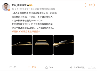 9月1日上午,零跑汽车曹力的一条微博引起了网友的广泛关注。内容是关于零跑即将发布的全新车型——Lafa5 将在9月8日慕尼黑车展亮相。短短一条微博,包含的信息量却相当大,里面隐含的内容更是激起观众很大的好奇心。咱们都知道,零跑目前已经有的B、C、T三大车系,涵盖从微型车到中大型各种级别的轿车与SUV。零跑汽车在今年的销量表现十分抢眼,已经连续6个月成为新势力销量第一,8月份销量再创新高,达到57066辆,平均不到1分钟就能卖出一辆车。而且上周的新增的订单持续保持在12K以上,在未来一段时间维持在新势力第一的问题不大。今年恰逢零跑汽车成立10周年,在形势一片大好的前提下,零跑推出Lafa5,到底有什么战略企图?