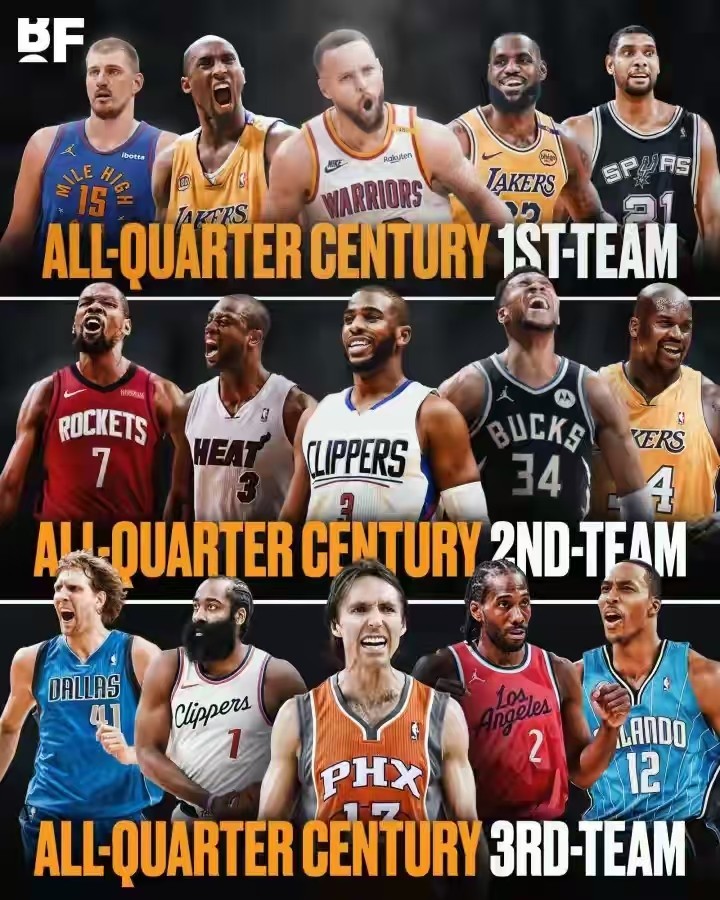 一阵这边的中锋是约基奇,他作为NBA最全面的中锋,在过去五个赛季里拿到了三次MVP,而且他还在23年带领掘金拿到了队史首冠,自己也收获了FMVP的荣誉,他的个人能力称得上现役NBA最佳,只要他在场上,队友都能够打出更好的表现。分卫这边无疑就是科比了,他也是本世纪NBA的最佳分卫,不论是影响力还是个人能力方面都没得说,毕竟他可是拿到了五次总冠军的球员,个人两次收获FMVP,一次拿到MVP,而且他还有11次一阵和9次防守一阵的经历,算是攻防一体的代表性球员。控卫的话选择库里就更没什么悬念了,除了他也挑不出什么球员,作为凭借一己之力加速NBA进入小球时代的球员,库里在三分线上的能力大家都很清楚,他只要抓到出手机会,那基本上就能稳稳命中三分,15-16赛季单赛季投进402记三分就是最好的证明,而且他还有四次总冠军,该拿的荣誉基本上都拿过来一遍了。