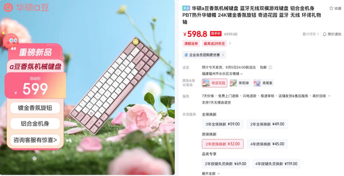 可选配的华硕a豆香氛机械键盘,支持蓝牙5.0与无线2.4G双模连接,并首创24K镀金香氛旋钮,不仅可装入香芯带来芳香,还支持轻按锁屏、旋动调节音量/Office办公软件缩放等智能操作。奇迹花园配色599元,鸢尾紫、茉莉绿配色499元。