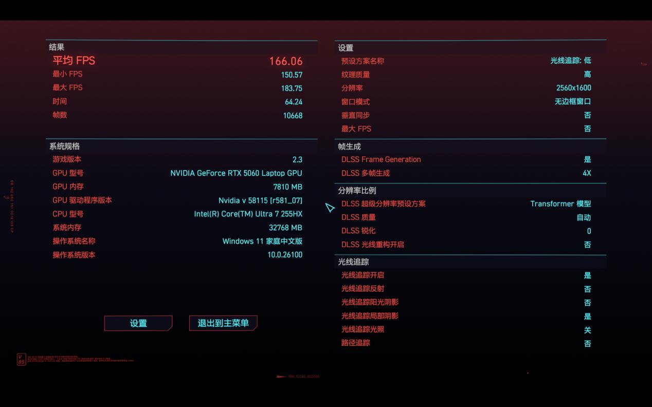 然后是《赛博朋克2077》,同样为2560x1600分辨率,在预设画质为超级下,开启DLSS4的4倍多帧生成,运行游戏内的Benchmark,最终得到平均162.09帧的成绩。