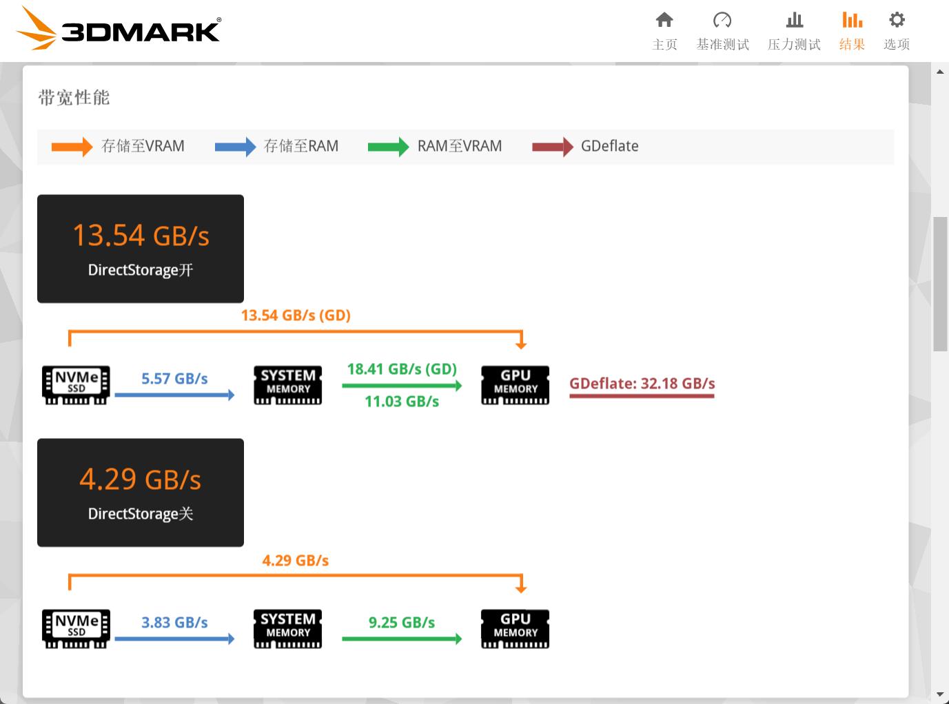 3DMARK DirectStorage功能测试是DirectX12 Ultimate的重要特性,它可以帮助笔记本更快的加载游戏,充分释放NVMe固态硬盘的潜力。实测启用DirectStorage之后,速度是之前的215.5%,进一步提升游戏的加载速度。