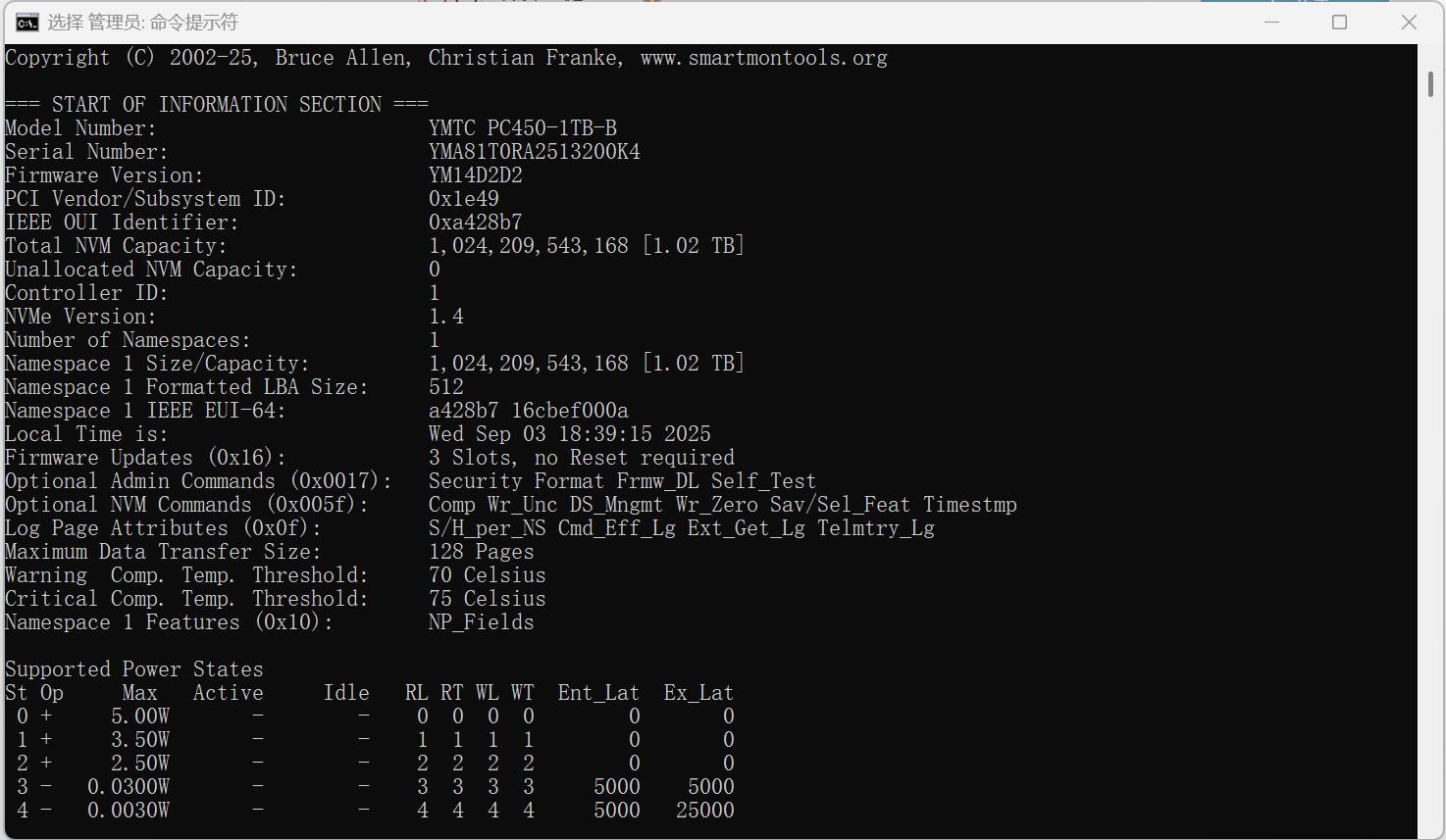 得益于晶栈®Xtacking®4.0架构闪存,PC450的功耗进一步降低,在smartmontools中可以看到有4种预设模式,全速运行PS0模式最高功耗仅为5W,浅度睡眠PS3模式可低至30mW,深度睡眠PS4模式更是低至3mW,可进一步提升电池的续航时间。