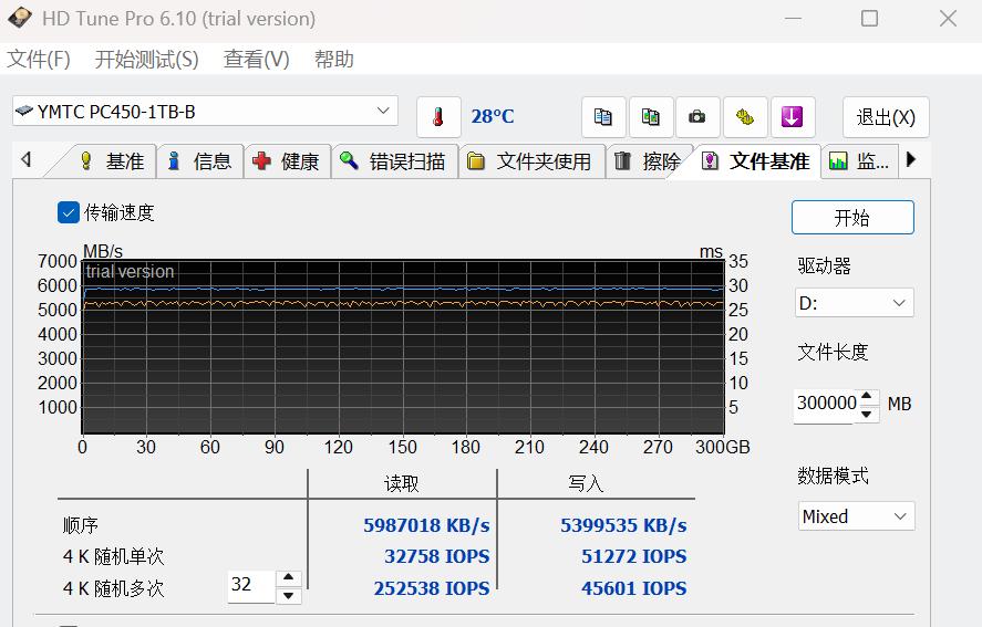 为了提升固态硬盘的连续性能,消费级固态硬盘普遍采用SLC缓存的做法。在HD Tune Pro中设置300GB文件长度,从写入图形看PC450写入速度基本稳定在5390MB/s,而且没有出现掉速情况,这意味着PC450的SLC缓存策略比较激进,至少1TB容量的SLC缓存已经超过了300GB,大幅提升了文件存取的效能。