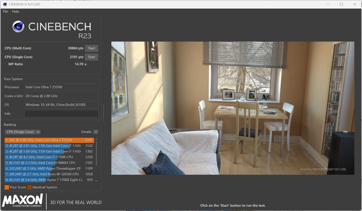 在Cinebench R23中,处理器的多核成绩为30884pts、单核成绩为2101pts,表现非常强劲。
