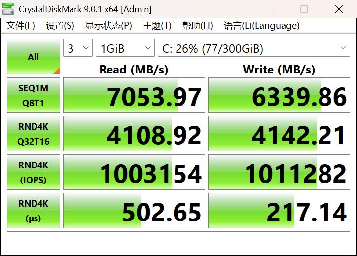 Crystal Disk Mark实测,PC450顺序读写速度达到7050.97MB/s和6339.86MB/s,均达到标称值;4K随机性能达到1003K IOPS和1011K IOPS,也基本达到标称水平,无论是大文件拷贝还是操作系统/游戏加载响应都会有非常理想的表现。